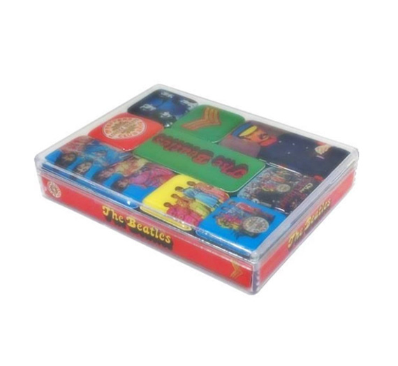 Set de 9 magnetos decorativos (6 cuadrados y 3 rectangulares) con temática del álbum Sgt. Pepper’s Lonely Hearts Club Band, de The Beatles.